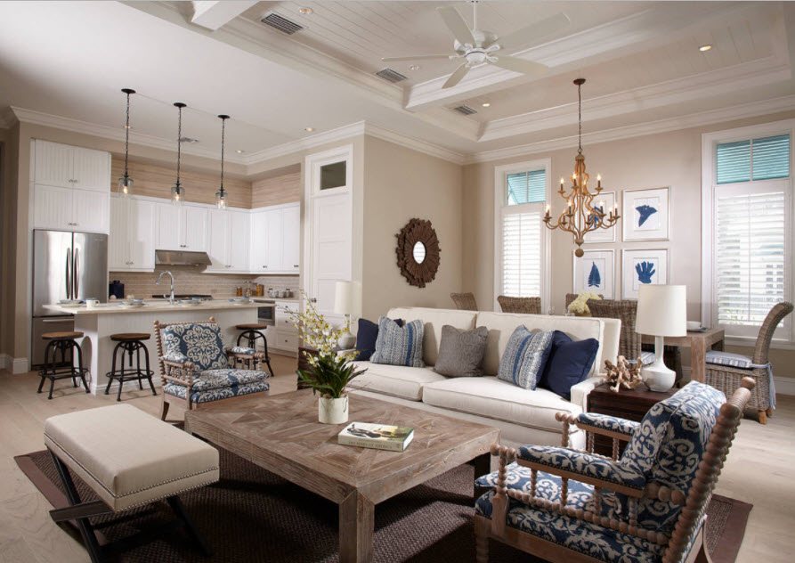 Бежевый цвет прекрасно сочетается со всеми стилями, где предполагается использовать деревянные покрытия. На его фоне отлично выглядят потолочные балки из древесины или ее имитации. Сюда же прекрасно вольется любая деревянная неокрашенная мебель.