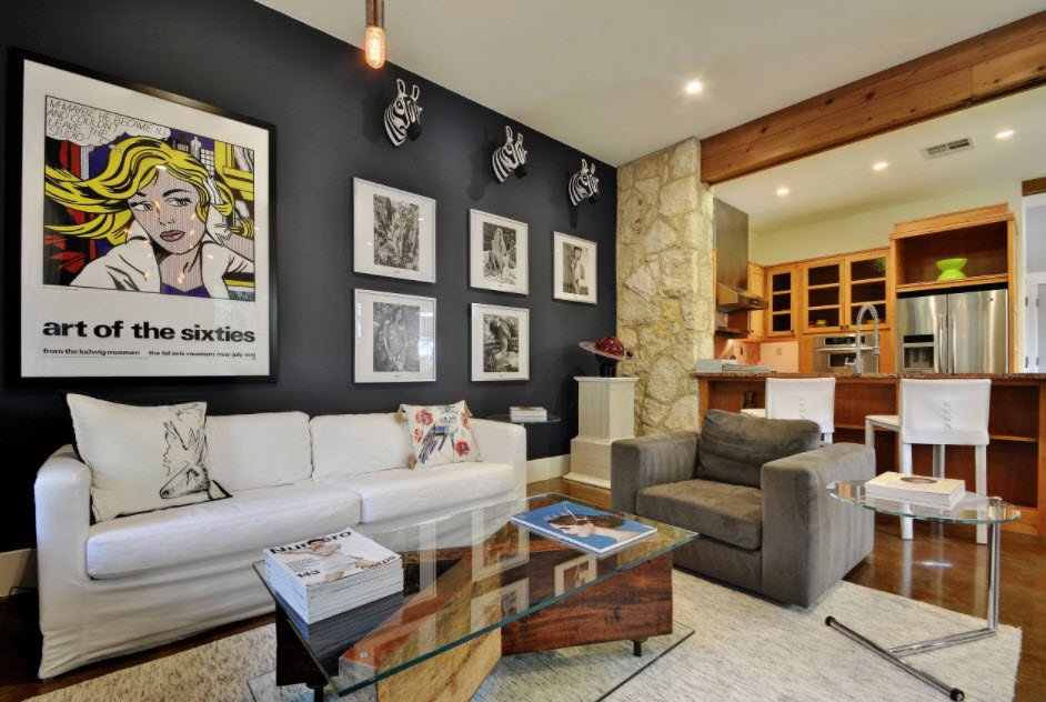 Нужно учесть, что интерьер гостиной с темным полом, стенами, потолком приемлем только для просторных помещений, если площадь гостиной меньше 18 м 2 , применять такой прием не стоит. Если комната небольшая, можно использовать менее радикальные варианты. К примеру, оригинально, необычно будет смотреться одна темная стена в гостиной в сочетании мебели с такой обивкой.