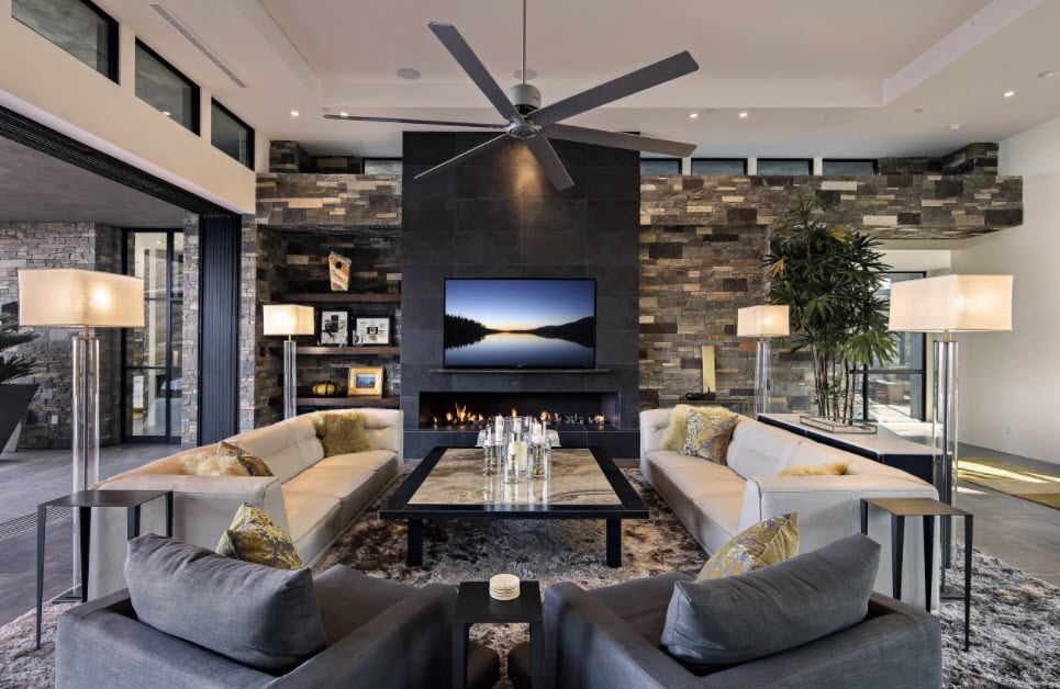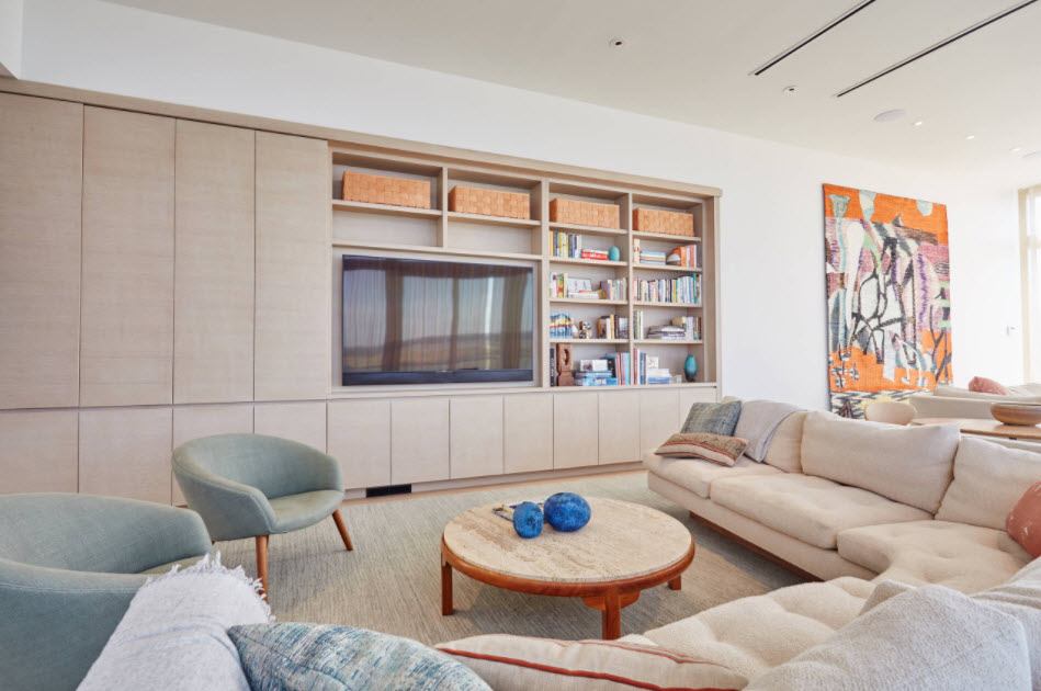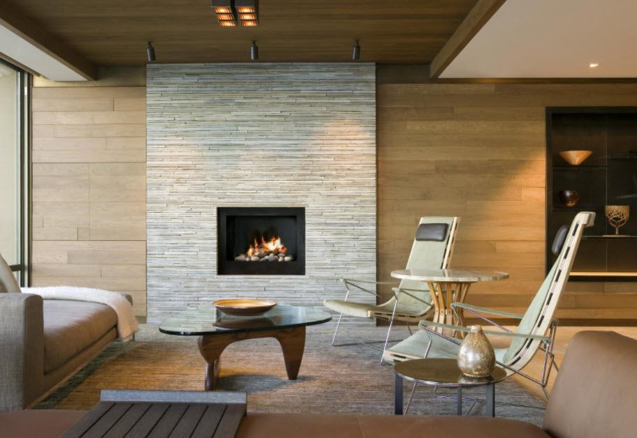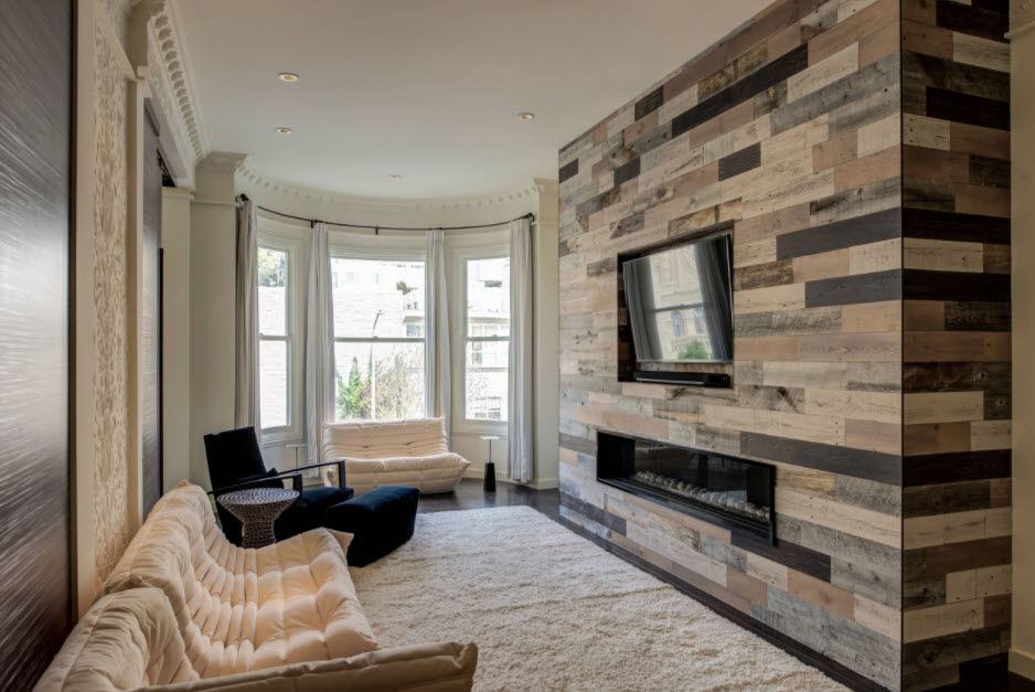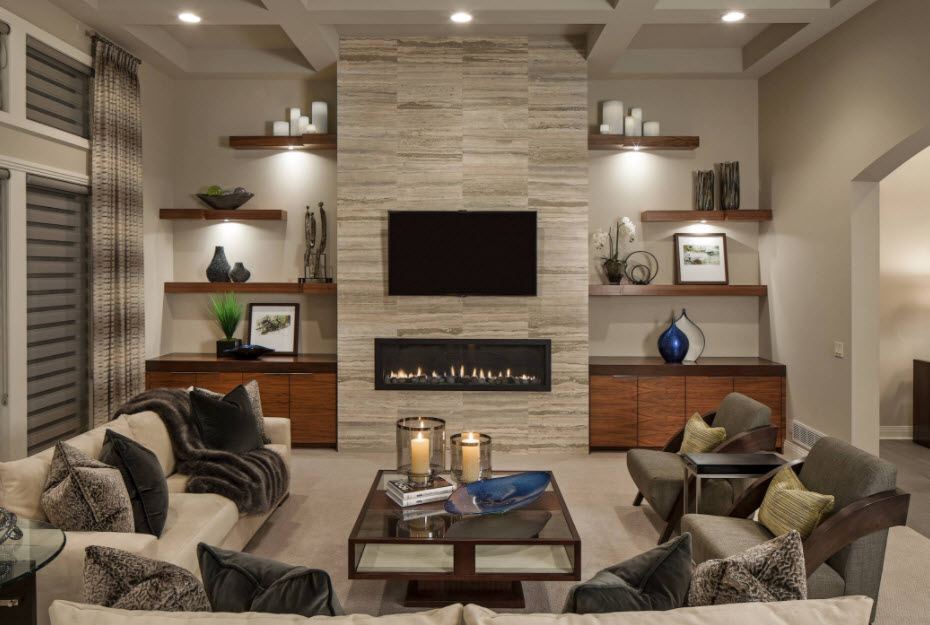 Стенка может быть в одной цветовой палитре со стенами или полом, также под нее рекомендуют подбирать элементы декора, диваны, стулья, мягкие кресла, полки и шкафчики.