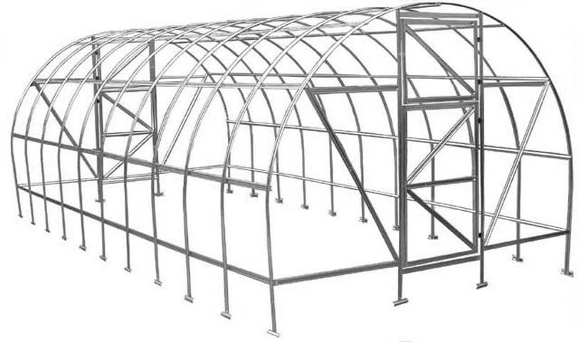 Конструкция теплицы представляет собой замкнутую трубу. Прочность материала гарантирует оцинкованное покрытие. Изогнутая форма имеет классический вид и практичнее в эксплуатации, чем П- или V-образная.