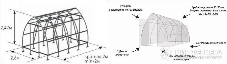 Кроме того, если сравнить частоту установки дуг, можно убедиться, что при сокращении расстояний между ними прочность сооружения повышается без применения дополнительных креплений. В стандартной модели дистанция между дугами составляет 1 м, а в усиленных – 0,67 м.