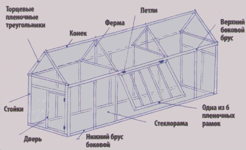 В большинстве случаев возводятся комбинированные парники из стекла. Для каркаса используются брусья 50х50 мм. Конструкция может быть остеклена неиспользуемыми оконными рамами, что существенно сэкономит финансовые средства. Другой вариант — использование стеклопакетов в профиле из поливинилхлорида. Понадобится основательно укрепить верхние оголовки и установить крышу с металлическими фермами.
