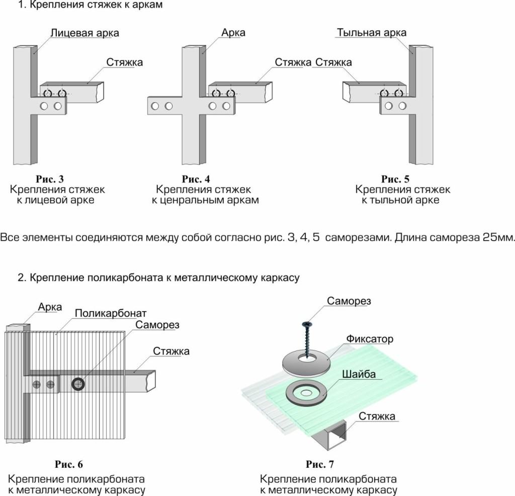 - Каркас собирается из дуг, расстояние между которыми составляет 1 м. Между собой они соединяются с помощью стяжек, болтов и шурупов.