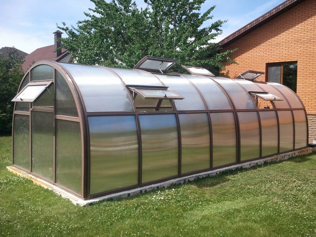 Самый дешевый и практичный вариант. Конструкции крыши выполняется в форме арки, за счет чего достигается максимальная светопропускная способность. Солнечные лучи, попадая на дугообразную поверхность кровли, легко рассеиваются по всей площади, что обеспечивает максимум тепла и света для посаженых растений.