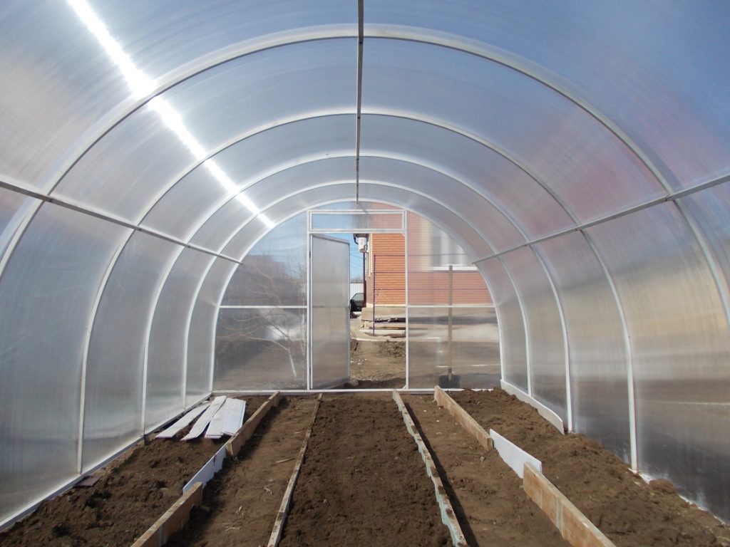 Отличный вариант для парника — поликарбонат, имеющий толщину 4 — 6 мм, но в этом случае и трубы надо брать полипропиленовые с диаметром от 32 мм. Несмотря на то, что стоит поликарбонат достаточно дорого, но зато прослужит он дольше.