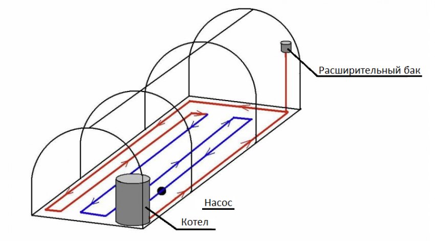 Менее современный, но действенный способ обогрева грядок – водяной обогрев при помощи труб. Схема обогрева – трубы проводят под землей и запускают в них подогретую воду. Охлажденная вода попадает в котел, который снова нагревает воду.