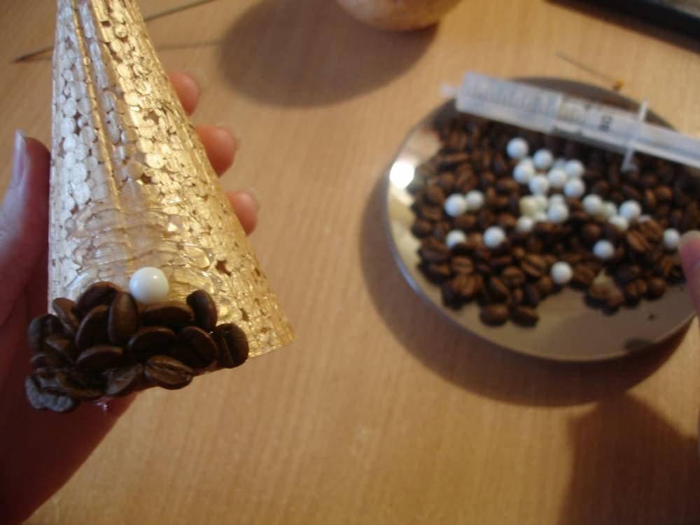 Кофейные зерна мы будем наклеивать на елку от основания и снизу вверх, в два слоя. Тонким слоем наносим на основу клей (здесь уже лучше брать прозрачный «Момент», чтобы его не было видно) и наклеиваем зернышки на основание плоской стороной, в шахматном порядке