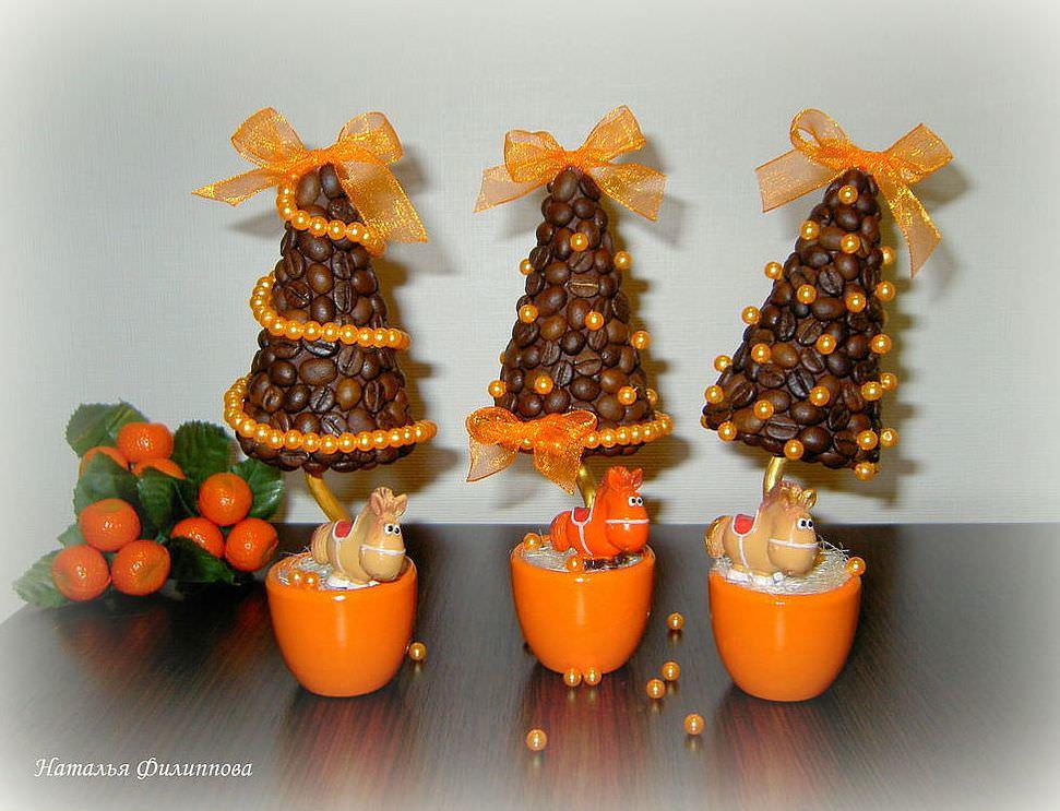 Топиарий из кофейных зерен и монет станет хорошим подарком как символ материального благополучия.