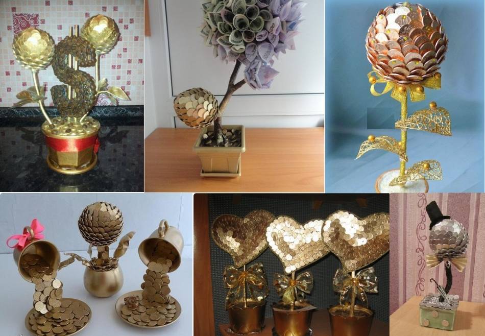 Несколько видов «денежного дерева» из монет: покрашены из болончика