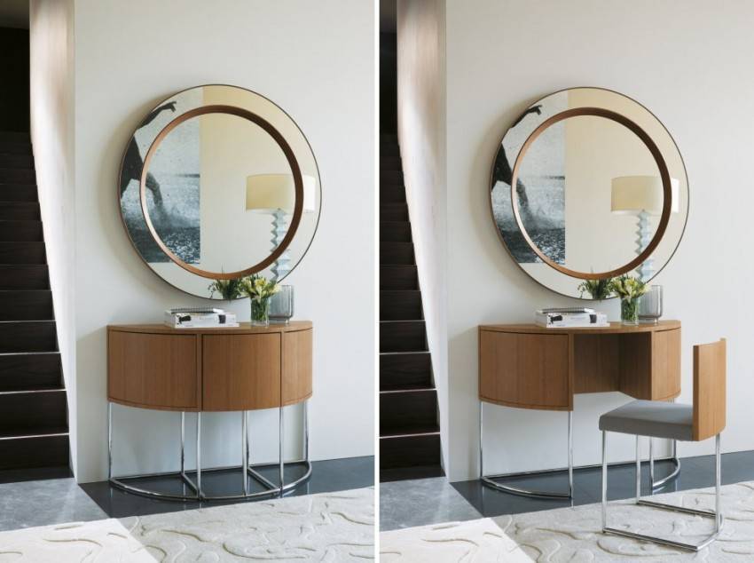 Туалетный столик, практически невозможно представить без зеркала. Оно, может быть скрыто в крышке консоли, иметь раскладной механизм или представлять собой отдельный аксессуар.