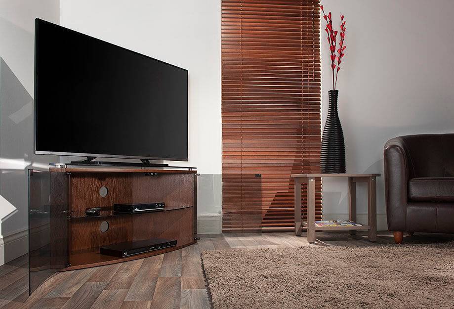 Угловые тумбы. Это настоящая находка для маленьких гостиных. Тумба располагается в углу, что позволяет экономить много места. При этом она ничем не отличается функционально от других видов тумб. Здесь также может быть комод, дополнительные ящики и отсеки для другой техники. Угловая тумба может иметь кронштейн, что увеличит угол обзора.