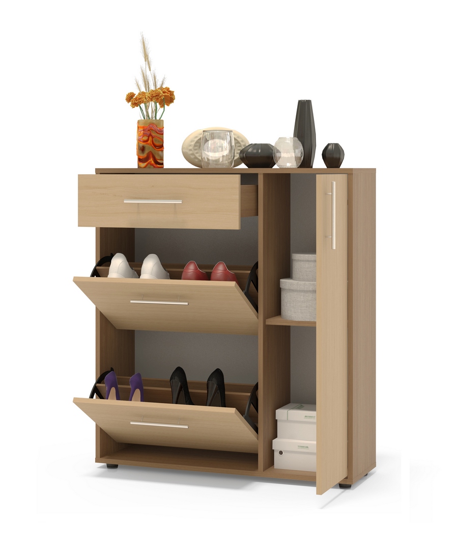- откидные ящики – в неглубоких тумбах ячейки под обувь устанавливают створку. При закрывании туфли оказываются в вертикальном положении. Эта система разработана для комодов и тумб с очень малой глубиной – менее 30 см;
