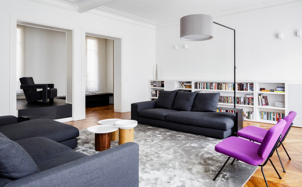 В качестве акцента можно в белой гостиной поставить диван с черной обивкой