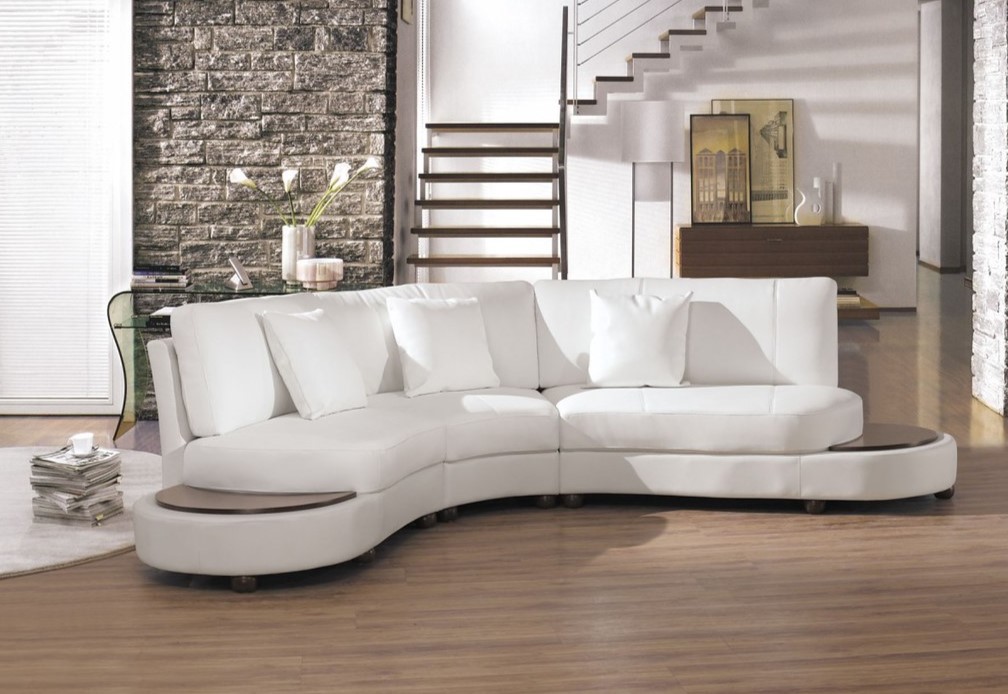 - Необычные овальные изделия – довольно габаритные угловые диваны в интерьере гостиной, которые потребуют немало места, но и эргономичных вариантов для установки подобных моделей не так уж много. Они уместны исключительно в больших и просторных залах.