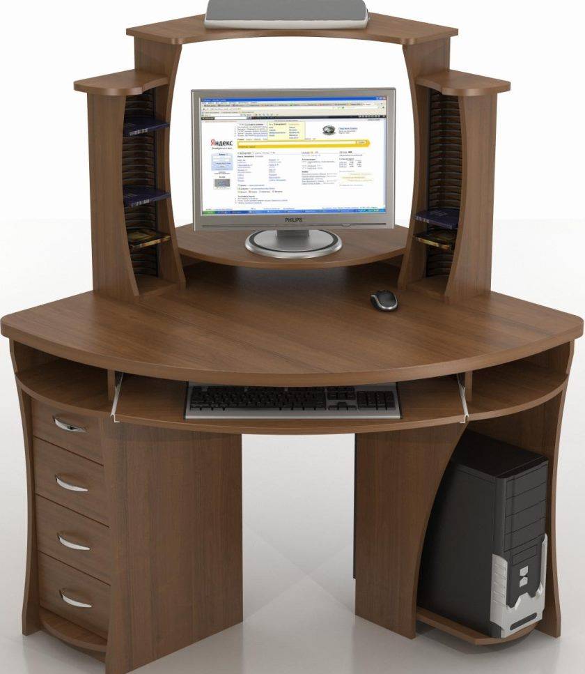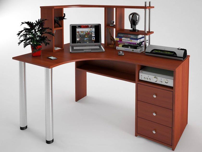 Конструкция углового компьютерного стола с полочками и ящиками