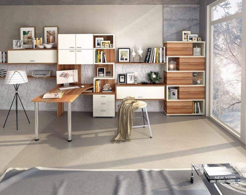 Большой угловой домашний офис со множеством ящиков и стеллажей