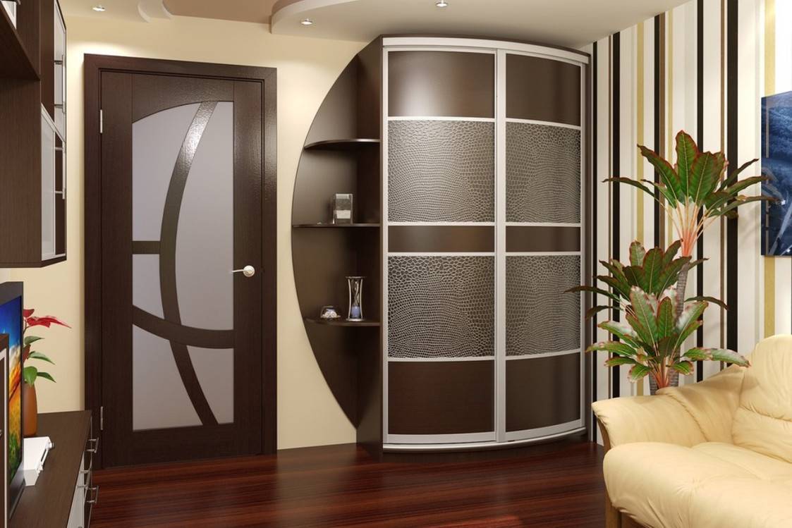 - радиусные шкафы — характеризуются наличием полукруглым фасадом – выпуклым или вогнутым. Первая форма встречается обычно в больших холлах, а второй тип является оптимальным вариантом для экономии пространства. Это оригинальные конструкции, имеющие стильный внешний вид.
