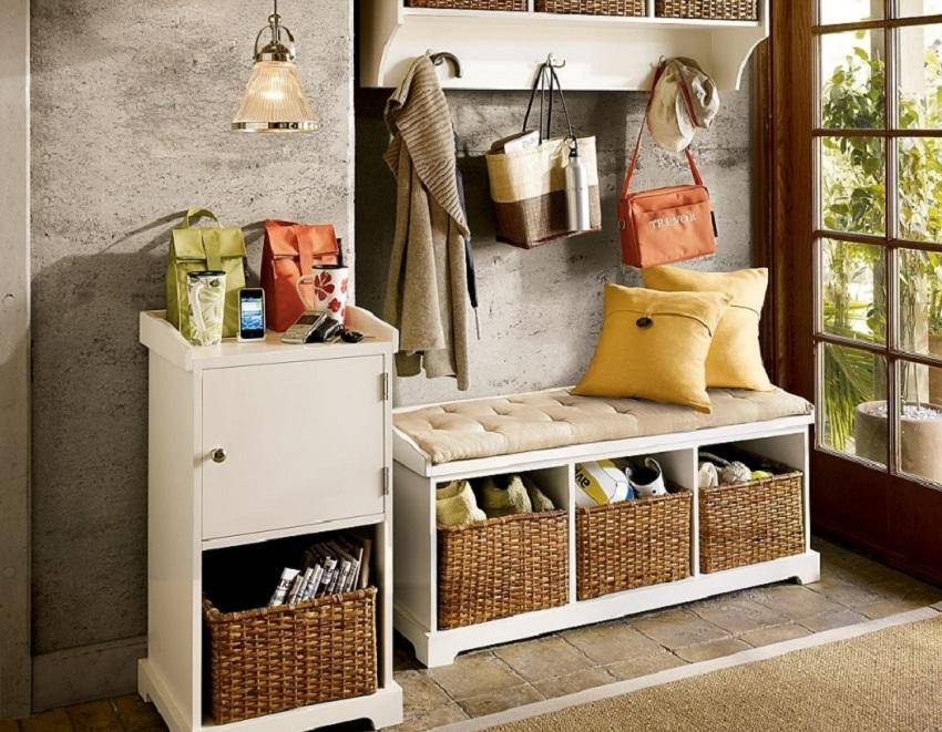 Прихожая для небольшой семьи Может содержать небольшую вешалку, комод, место под обувь и сидение