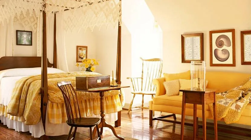 Для аристократического интерьера подойдет небольшой диванчик без спинки у изножья кровати. На нем легко разместятся плед и ночная сорочка.