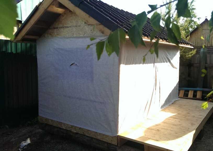 Дальше дело за внутренней отделкой и утеплением. Сначала набивается ветрозащитная мембрана (чтобы не холодно было), затем крепится базальтовая вата (10 см толщина, чтобы стала как раз на глубину доски.