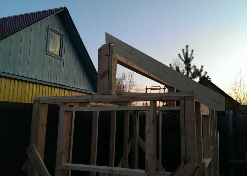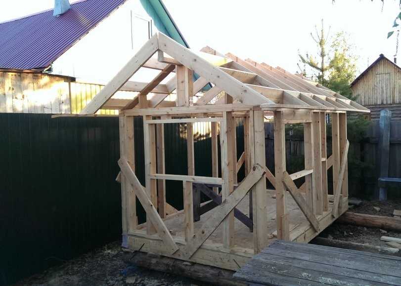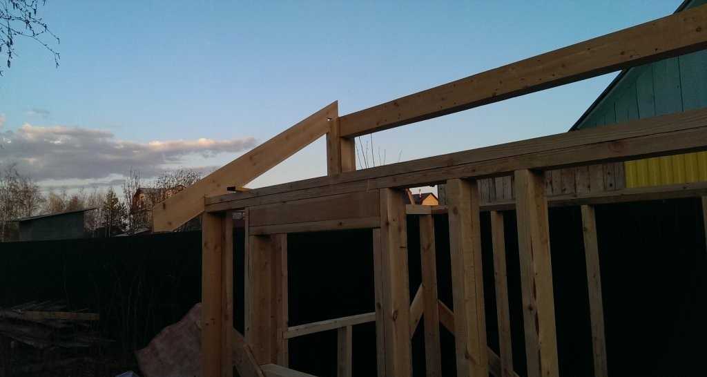 закрепите стропила (3 шт.) на каркасное основание брусом, расположите по отвесу и объедините с каркасом железными держателями;