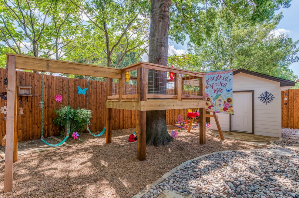- наличие пристроек: забор или другая ограда, терраса, песочница, лестница, может быть, горка или качели;
