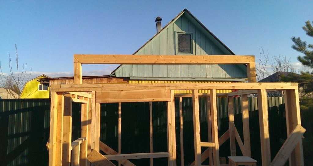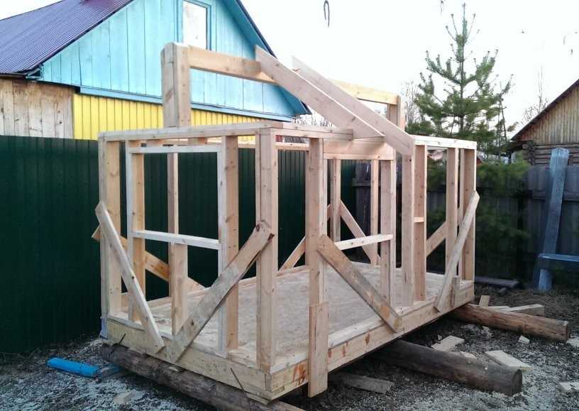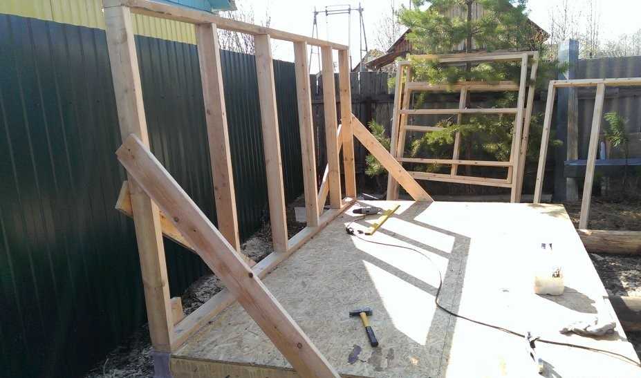 Далее собираем каркас стен. Стойки ставим с шагом в 1 метр, под окна и двери — удвоенные. Так как сверху будет набито с одной стороны ОСБ, с другой — фанера, конструкция будет жесткой. Укосины не ставим. Они нужны, если будет детский домик оббиваться вагонкой или другим реечным материалом.