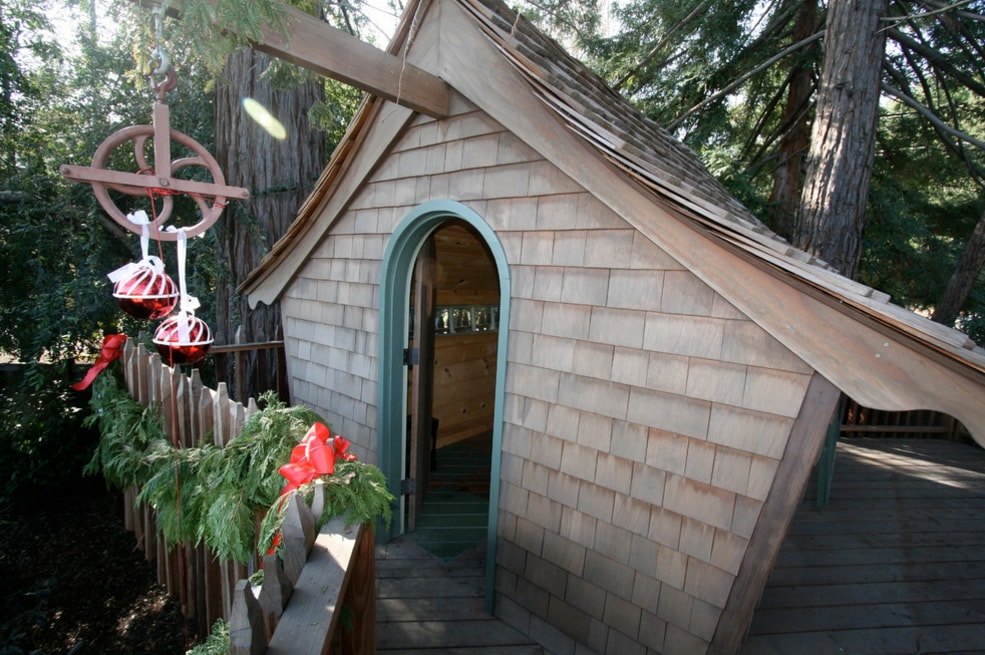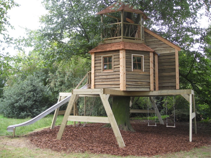 По той же технологии можно построить домик на дереве. Надо будет закрепить площадку, а все остальное очень похоже.
