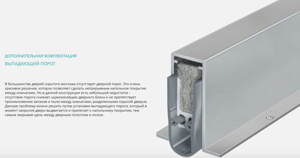 Выпадающая планка отличается простой и бесшумной конструкцией. В закрытом состоянии проема она перекрывает пространство между полом и нижней частью двери, а в открытом — убирается в специальные пазы. Автоматический порог — техническое соединение алюминиевого профиля, резинового уплотнителя и торцевой кнопки, при нажатии на которую срабатывает механизм выдвижения устройства.