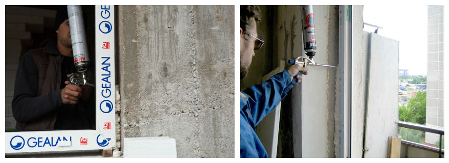 Теперь монтажный шов следует заделать в боковых зонах. Полиуретановая пена предназначается для обеспечения надежной гидроизоляции, с ее использованием стекло не будет запотевать. До заделки и после этого швы обрызгивают водой, чтобы улучшить полимеризацию.