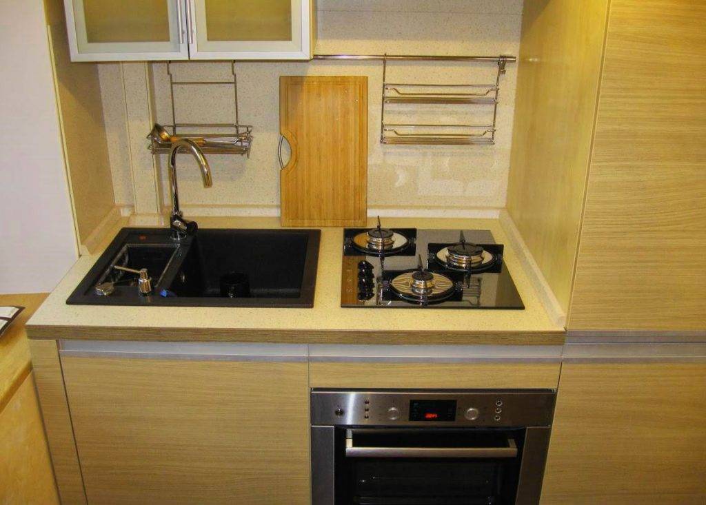 Правила эргономики на кухне советуют соблюдать правило треугольника, т. е. располагать точки работы (плиту, мойку, разделочный стол) так, чтобы они составляли треугольник со сторонами не более 1 м. В небольшой кухне с размещением мебели вдоль 1 стены плита рядом с мойкой оказывается не самым удобным вариантом. Удачнее расположение раковины и плиты по сторонам разделочного стола. Его длина не превышает 60 см.