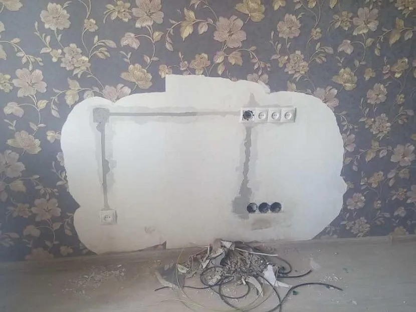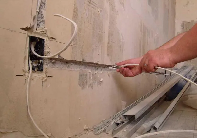 А если предполагается проброс электрических проводов по внешней стороне простенка, в гипсокартоне режется канавка (штраба), проводится электропровод и фиксируется быстротвердеющим составом (к примеру – алебастром). Концы проводки выводятся на установленном уровне в требуемых местах.