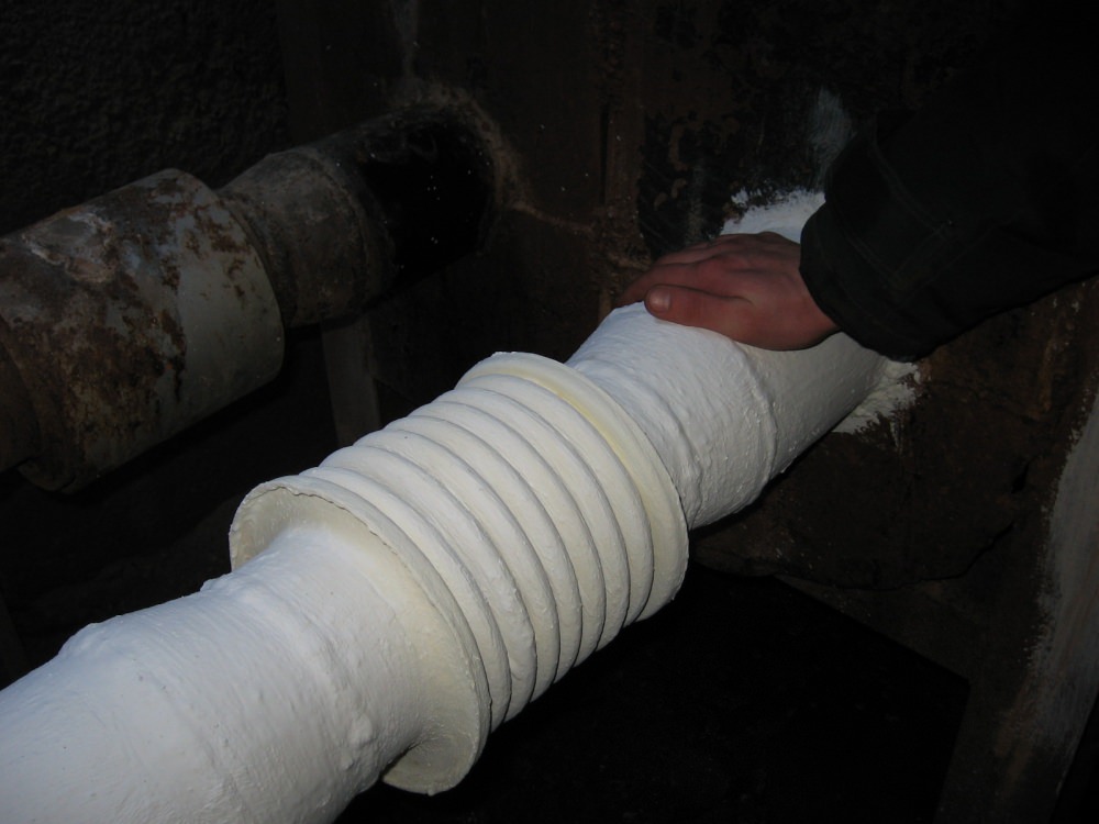 При утеплении теплотрасс также используют изделия из ППУ — скорлупы. Материал заливают в пресс-форму, чтобы получить цилиндры из пенополиуретана, которые затем надевают на трубы. Их закрепляют металлическими жгутами и полиуретановым клеем.