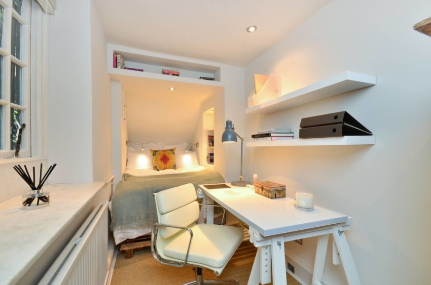 При необходимости использовать комнату в качестве полноценного рабочего места, можно установить кровать с откидным или подъемным механизмом.