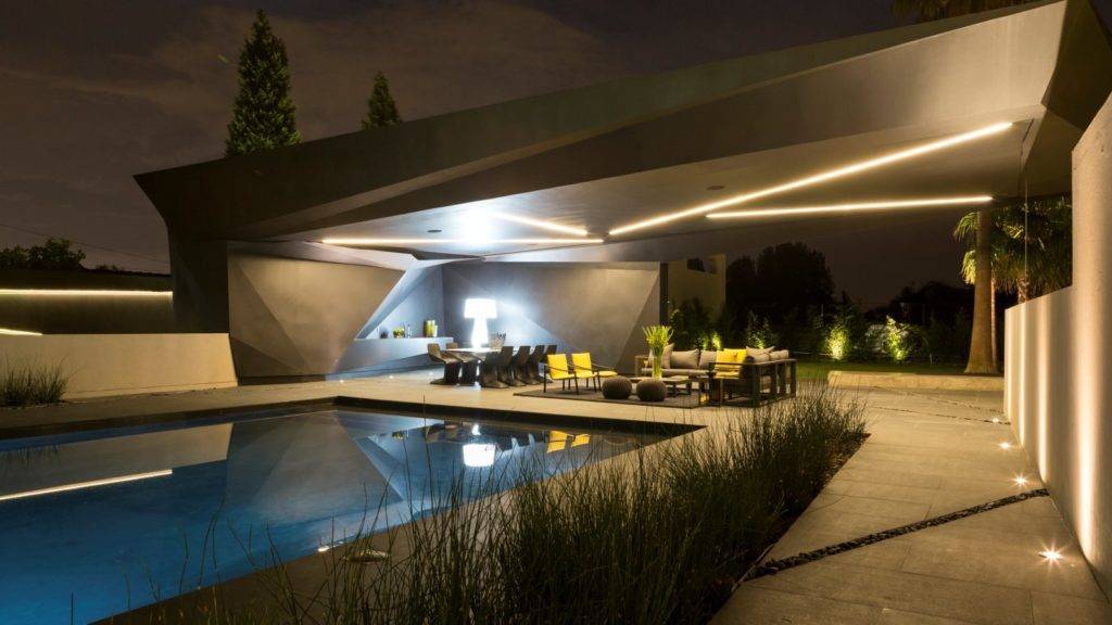 Внешние стены виллы обшиты кедром, а при желании между опорами навеса можно натянуть пленку и отгородить внутреннее пространство от холода.