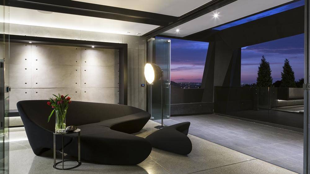 С удобного дивана в гостиной открывается прекрасный вид на большой бассейн с прозрачно-голубой водой. На верхних этажах расположены четыре спальни и две детские комнаты. Минимальное количество мебели, окна-стены от пола до потолка и строгая цветовая палитра, использованная в интерьере, создают ощущения необычайного простора. Полное единение с природой достигается также благодаря балкону, выходящему из главной спальни, с прекрасным видом на сад.