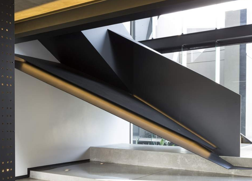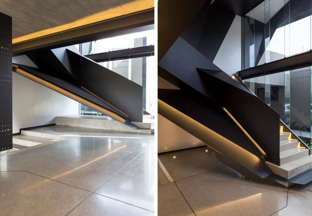 Никакого декора, только металл и стекло. Огромное окно-стена является общим для первого и второго этажа. Здесь же начинается и лестница, по которой можно попасть на верхние этажи. Стремительные очертания немного смягчены перфорированными полосами металла и небольшими светильниками, вмонтированными под лестничными маршами.