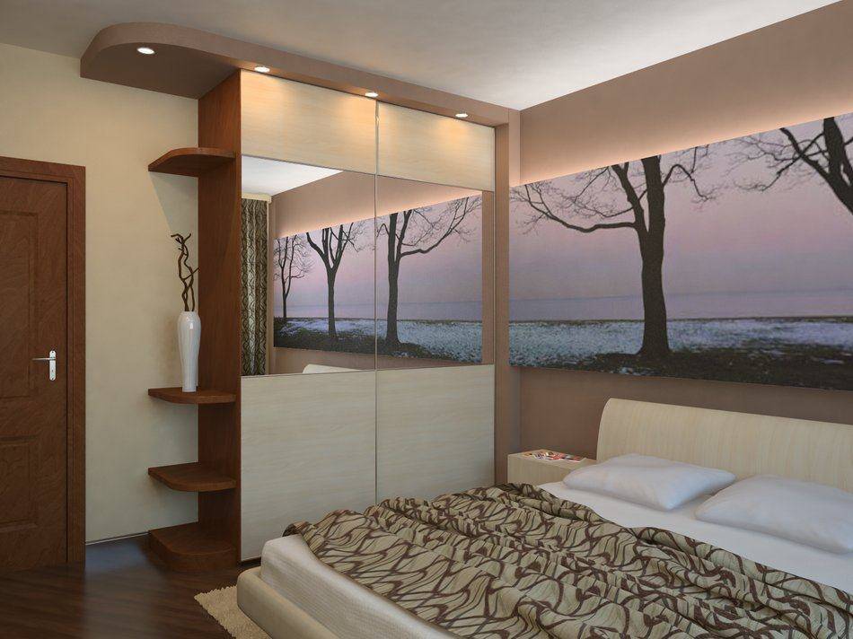 - встроенный шкаф-купе вдоль узкой стены (это позволит длину спальни немного сократить), причём двери должны быть матовыми;