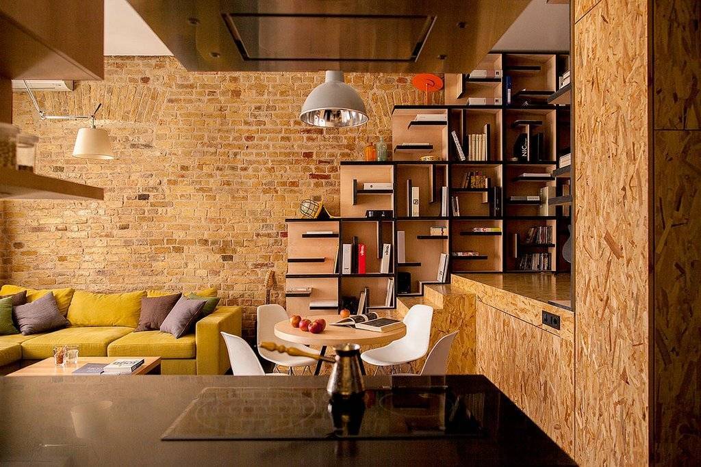 Еще одним заслуживающим внимания материалом на основе дерева являются стружечные ОСБ-плиты. Потолок на кухне, для отделки которого использовались плиты ОСБ, в чистом виде будет смотреться весьма своеобразно, поэтому для придания ему более привычного вида его можно покрасить масляным или алкидным составом. Если вам нравится структура ОСБ-плит, для обработки материала используйте матовую или глянцевую пропитку.
