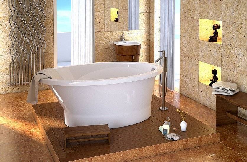 Отдельно стоящая или встроенная ванна. Она может устанавливаться прямо возле стены, при строительстве украшаться бортом или плинтусом на стыке со стеной.
