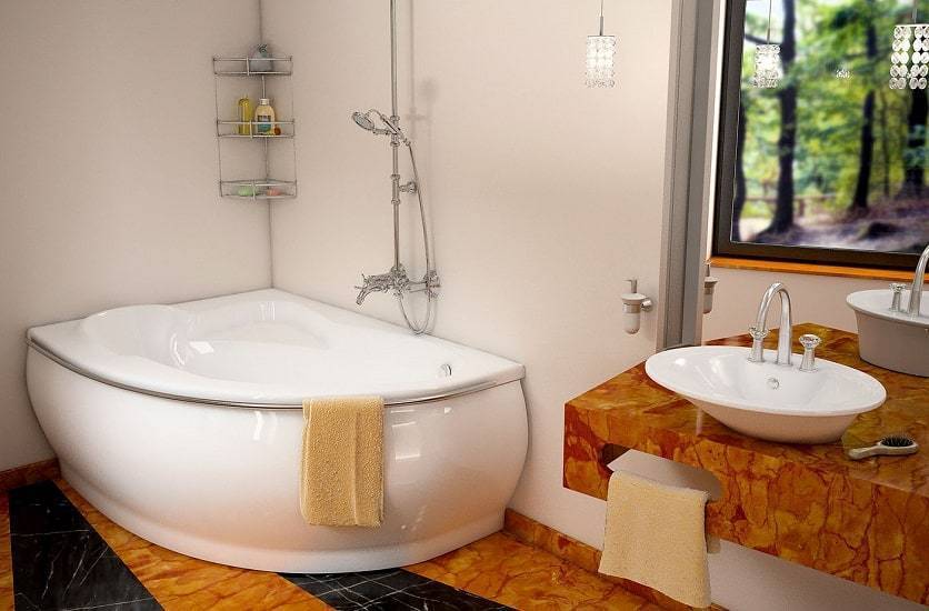 Угловая конструкция чаши. Это может быть форма ванной, которая обтекает полку, установленную в помещении возле нее. Или чаша выполнена так, что идеально подходит под угол комнаты, остальные же ее элементы выполнены полукругом.