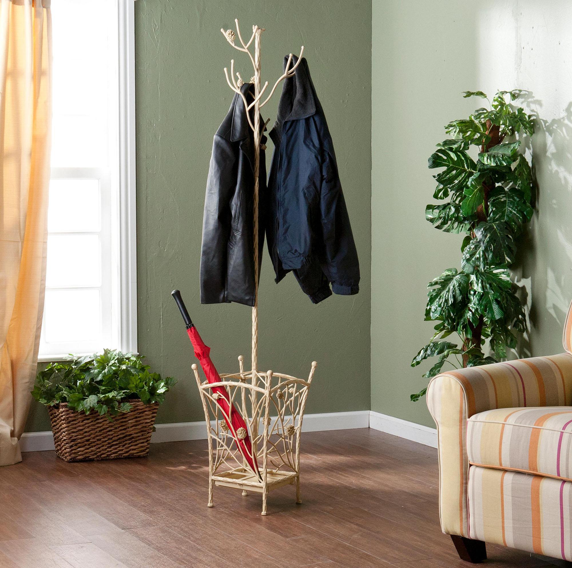 Украшением прихожей станет напольная кованая вешалка. Лучше подобрать модель, у которой есть отсек для зонтиков.