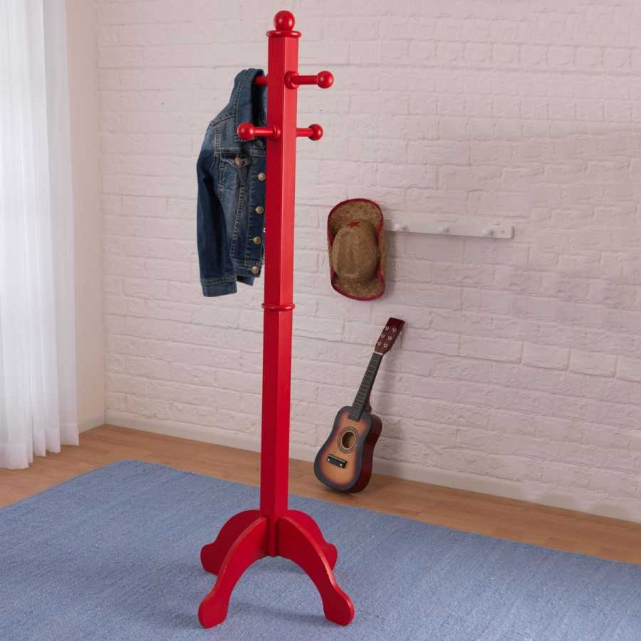 Для детских лучше подобрать полностью деревянную модель, окрашенную в яркие, праздничные цвета, при изготовлении которой металл не используется, а единственно «инородными» деталями являются пластиковые крючки для одежды.