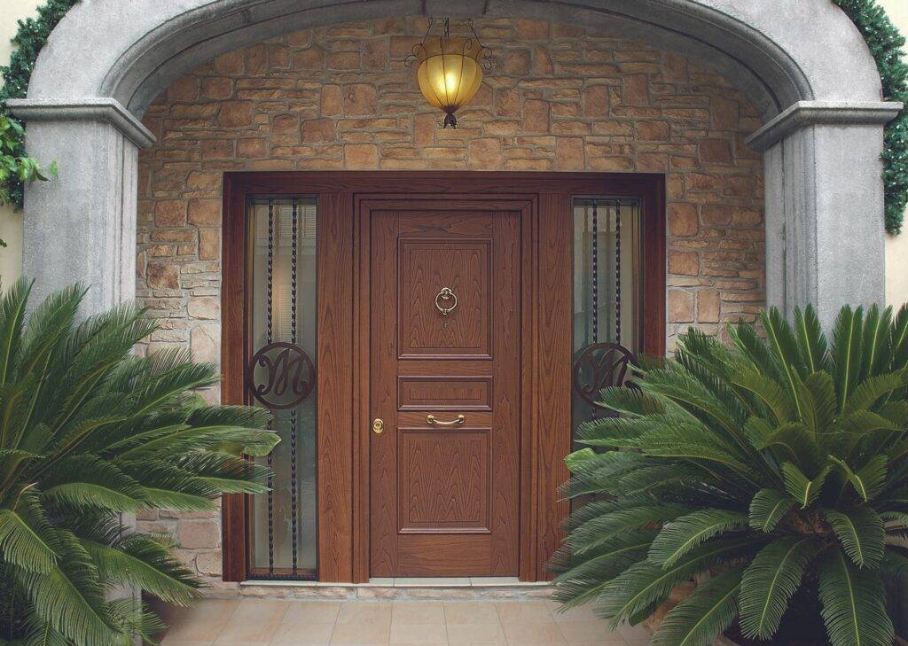 Широкие вертикальные фрамуги из стекла следует сочетать с декором дверного полотна (часто это готовые комплекты стандартных размеров), и учитывать, насколько важна на конкретном входе в дом степень защиты от проникновения злоумышленников