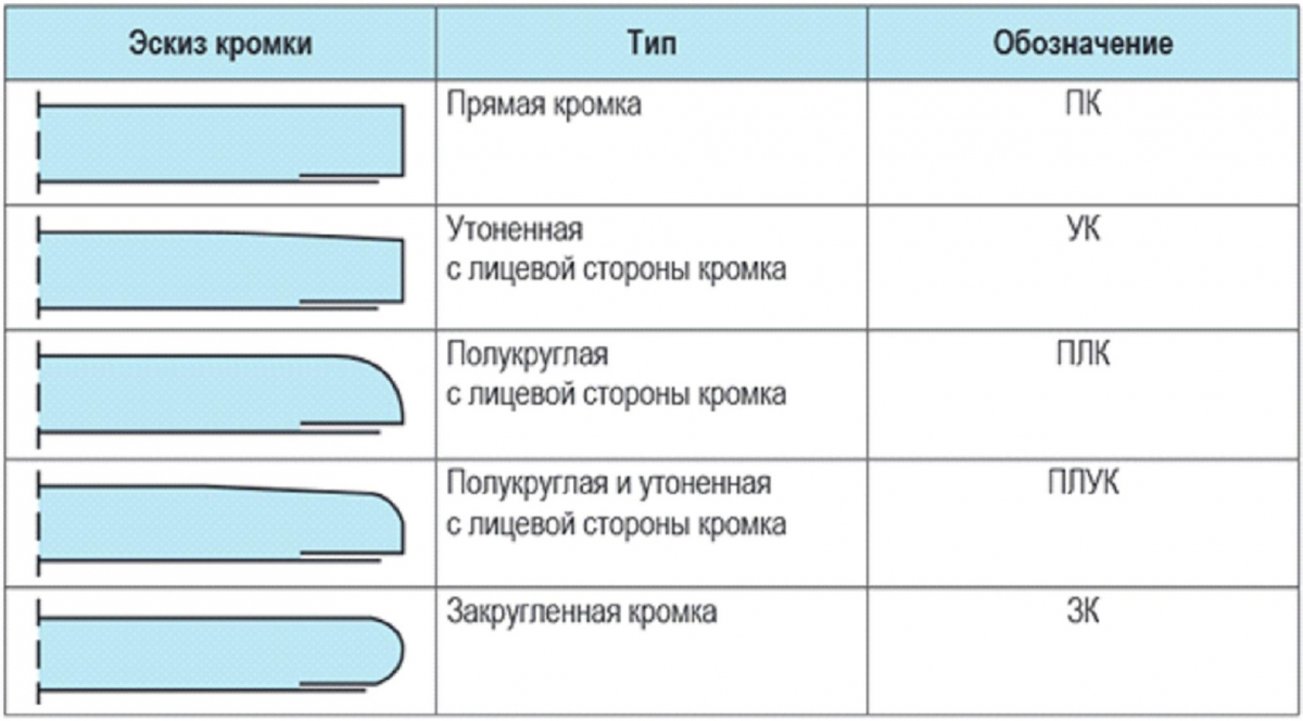 Существует общая классификация материала с учётом характеристик, назначения и отдельное разделение, при котором берётся в расчёт тип кромки листа.