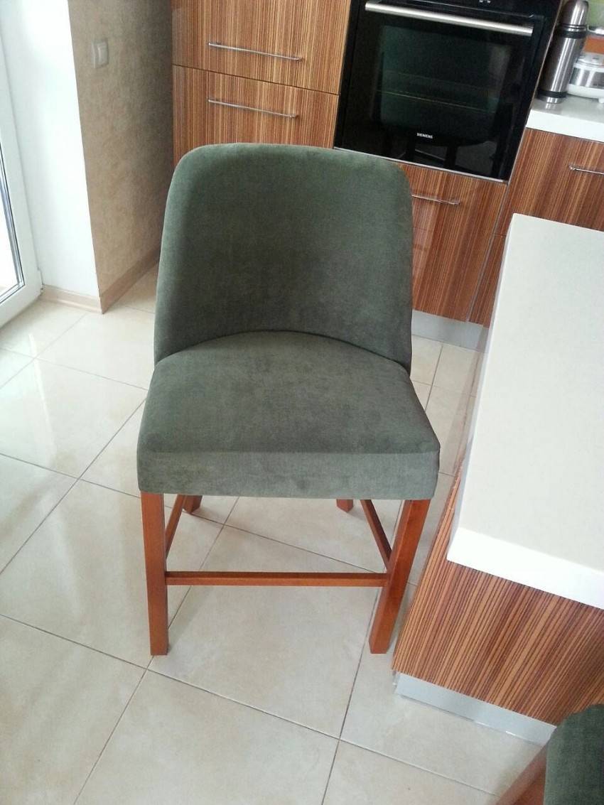 Стул для кухни с мягким сиденьем можно красиво оформить чехлом из ткани. С его помощью также получиться обезопасить обивку от грязи. Материал подбирают в зависимости от общего оформления стиля помещения.