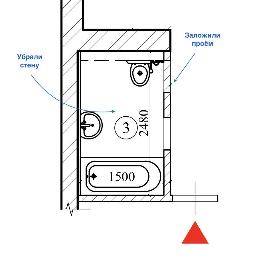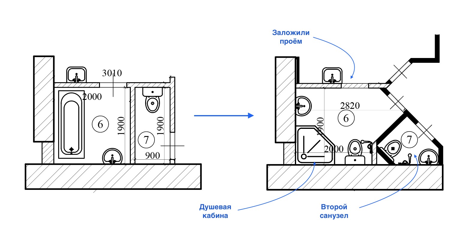 После перепланировки в квартире появился совмещенный санузел и дополнительный туалет.