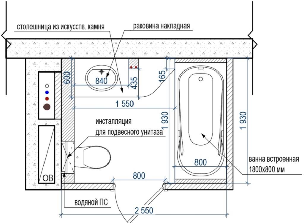В некоторых квартирах санузел является совмещённым и его площадь составляет 3,5 м2. Габариты такого помещения составляют (2,2х1,6 м). Короткая сторона комнаты, которая в длину составляет 1,6 м, может быть использована для установки ванны. Такое расположение ванны позволит разместить в комнате и другие сантехнические приборы (унитаз, раковина и т. д.).