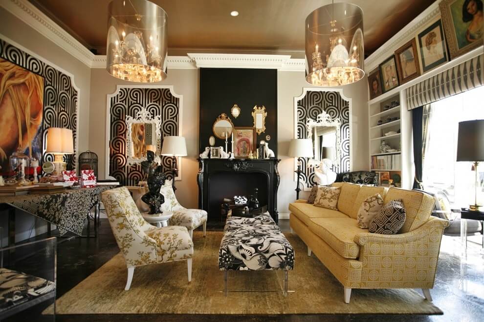 - Яркие цвета. Палитра зависит от периода, под который стилизуется пространство, но в основном используются насыщенные (голубой, оранжевый, желтый, красный) или плотные, глубокие (бордо, индиго) оттенки.