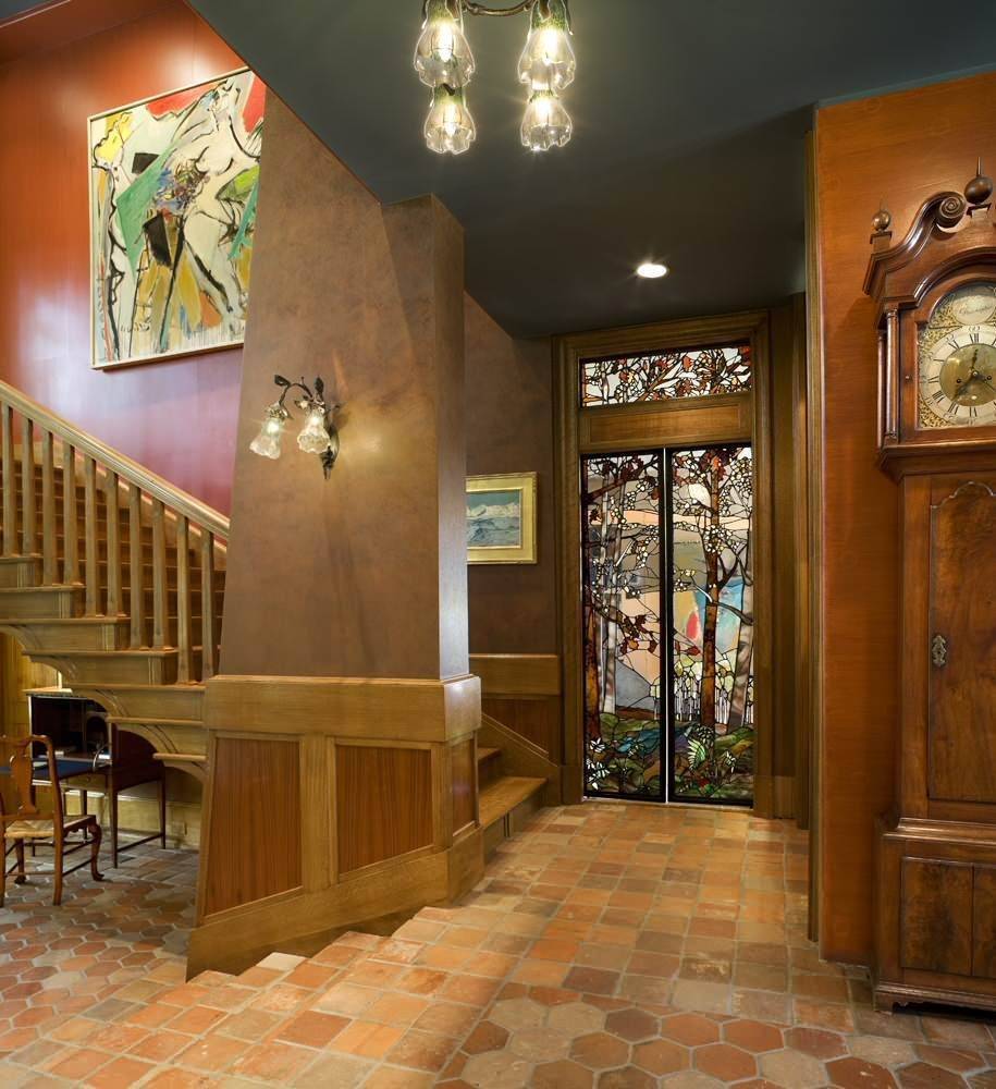 Окна с витражной пленкой в интерьере бильярдной комнаты